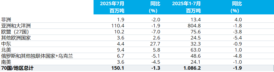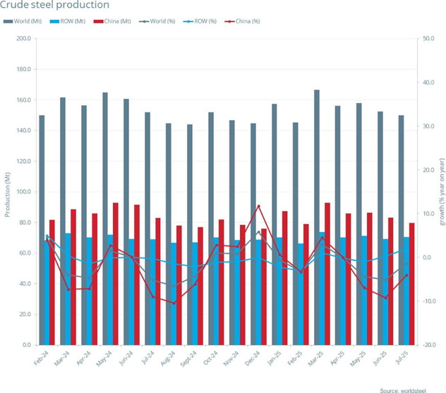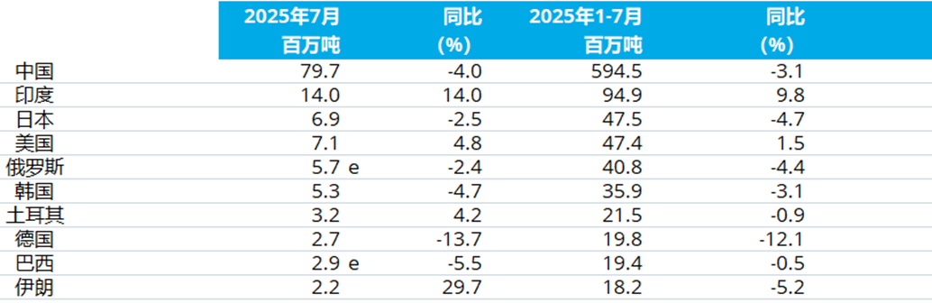 2025年7月全球70個納入世界鋼鐵協(xié)會統(tǒng)計國家/地區(qū)的粗鋼產(chǎn)量為1.501億噸,同比下降1.3%。