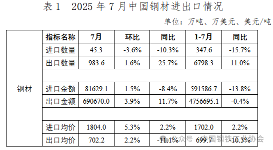 2025年7月,我國(guó)出口鋼材983.6萬噸,較上月小幅回升1.6%,出口規(guī)模保持相對(duì)穩(wěn)定,出口均價(jià)702.2美元/噸,較上月小幅上漲2.2%。1-7月,我國(guó)累計(jì)出口鋼材6798.3萬噸,同比增長(zhǎng)11.0%,出口均價(jià)699.7美元/噸,同比下跌10.3%。7月,我國(guó)進(jìn)口鋼材45.3萬噸,環(huán)比下降3.6%,降幅較上月進(jìn)一步擴(kuò)大,進(jìn)口均價(jià)1804.0美元/噸,環(huán)比上漲5.3%。1-7月,我國(guó)累計(jì)進(jìn)口鋼材347.6萬噸,同比下降15.7%,進(jìn)口均價(jià)1702.0美元/噸,同比上漲2.2%。