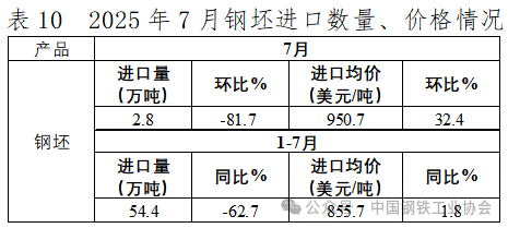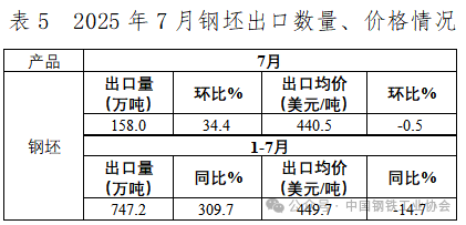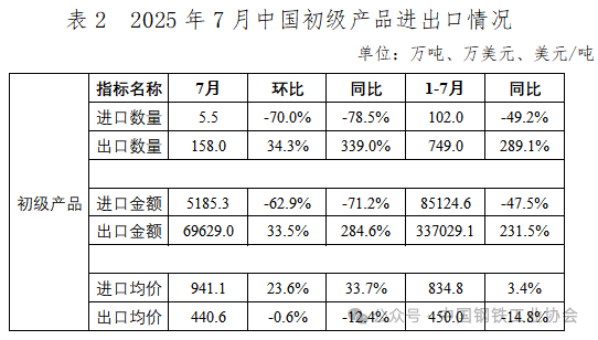 2025年7月,我國(guó)出口初級(jí)產(chǎn)品(鋼坯、生鐵、直接還原鐵及再生鋼鐵原料)158.0萬噸,環(huán)比增長(zhǎng)34.3%;出口均價(jià)440.6美元/噸,環(huán)比基本持平。1-7月,我國(guó)累計(jì)出口初級(jí)產(chǎn)品749.0萬噸,同比增長(zhǎng)2.9倍;出口均價(jià)450.0美元/噸,同比下跌14.8%,降幅較1-6月小幅收窄。7月,我國(guó)進(jìn)口初級(jí)產(chǎn)品5.5萬噸,環(huán)比大幅下降70.0%;進(jìn)口均價(jià)941.1美元/噸,環(huán)比增長(zhǎng)23.6%。1-7月,我國(guó)累計(jì)進(jìn)口初級(jí)產(chǎn)品102.0萬噸,同比下降49.2%;進(jìn)口均價(jià)834.8美元/噸,同比上漲3.4%。進(jìn)出相抵,1-7月我國(guó)折合粗鋼凈出口7384萬噸,較上年同期增加1424萬噸,同比增長(zhǎng)23.9%。