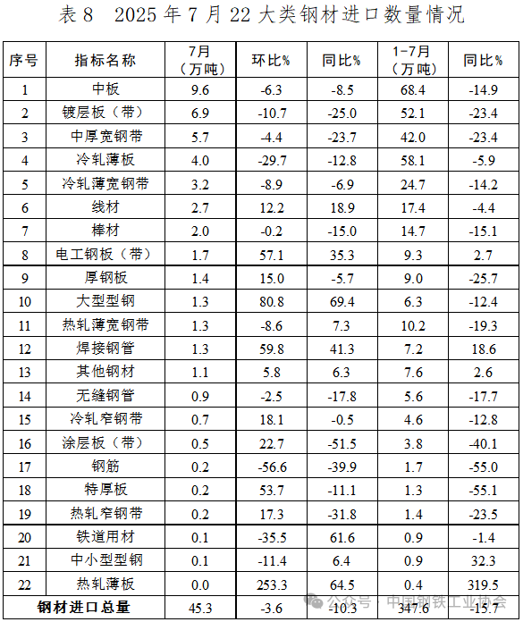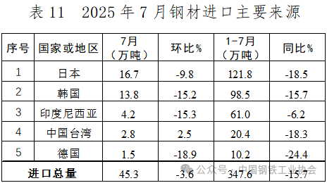 2025年7月,我國(guó)鋼材進(jìn)口規(guī)模持續(xù)萎縮,為近10年以來單月進(jìn)口量最低水平。各主要品種進(jìn)口量環(huán)比大多下降,進(jìn)口前5位的品種占當(dāng)月我國(guó)鋼材進(jìn)口總量的比重較上月有所下降。7月,我國(guó)鋼材的主要進(jìn)口來源及結(jié)構(gòu)仍保持穩(wěn)定,除自中國(guó)臺(tái)灣進(jìn)口鋼材環(huán)比回升外,自其它主要國(guó)家進(jìn)口鋼材數(shù)量環(huán)比均下降,且降幅大于總體水平。