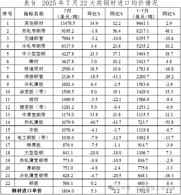 7月,22大類鋼材品種中,有12類品種進(jìn)口量環(huán)比下降,環(huán)比降幅超過10%的品種有4個(gè);進(jìn)口量前5位的品種環(huán)比均出現(xiàn)下降,冷軋薄板降幅最大。1-7月,僅電工鋼板(帶)等5個(gè)品種累計(jì)進(jìn)口量同比增長(zhǎng)。7月,各品種出口單價(jià)漲跌互現(xiàn),單月進(jìn)口量前5位的品種中,中厚寬鋼帶進(jìn)口單價(jià)環(huán)比漲幅最大。7月,我國(guó)鋼坯進(jìn)口量環(huán)比大幅下降81.7%,進(jìn)口量回落至今年5月水平。