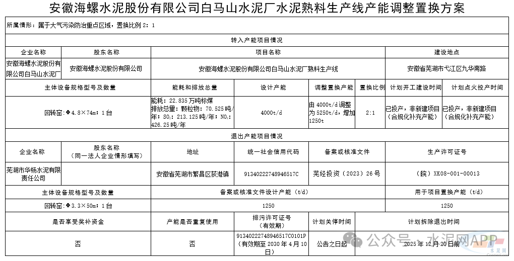 根據《水泥玻璃行業(yè)產能置換實施辦法(2024年本)》等文件要求,安徽海螺水泥股份有限公司白馬山水泥廠1條4000t/d水泥熟料生產線通過補產能方式將產能增加到5250t/d,置換產能來自蕪湖市華楊水泥有限責任公司、蕪湖瑞信水泥有限公司,置換比例為2:1。