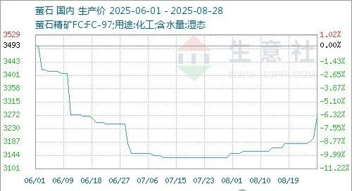 8月份國內(nèi)螢石價格走勢上漲,截止月末國內(nèi)螢石均價為3268.75元/噸,較月初價格3150元/噸上漲3.77%,同比下滑7.62%。