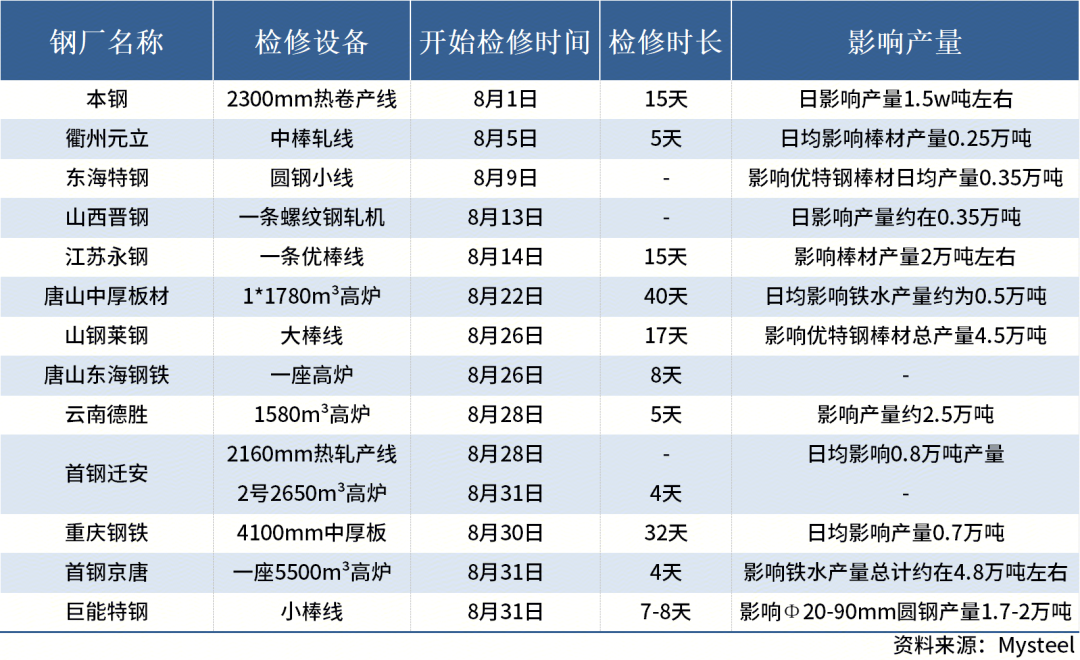 據(jù)Mysteel不完全統(tǒng)計(jì),8月以來(lái)國(guó)內(nèi)13家鋼廠發(fā)布檢修信息,其中,首鋼京唐計(jì)劃于8月31日對(duì)一座5500m3高爐進(jìn)行檢修至9月3日結(jié)束,為期4天左右,影響鐵水產(chǎn)量總計(jì)約在4.8萬(wàn)噸左右。具體情況如下: