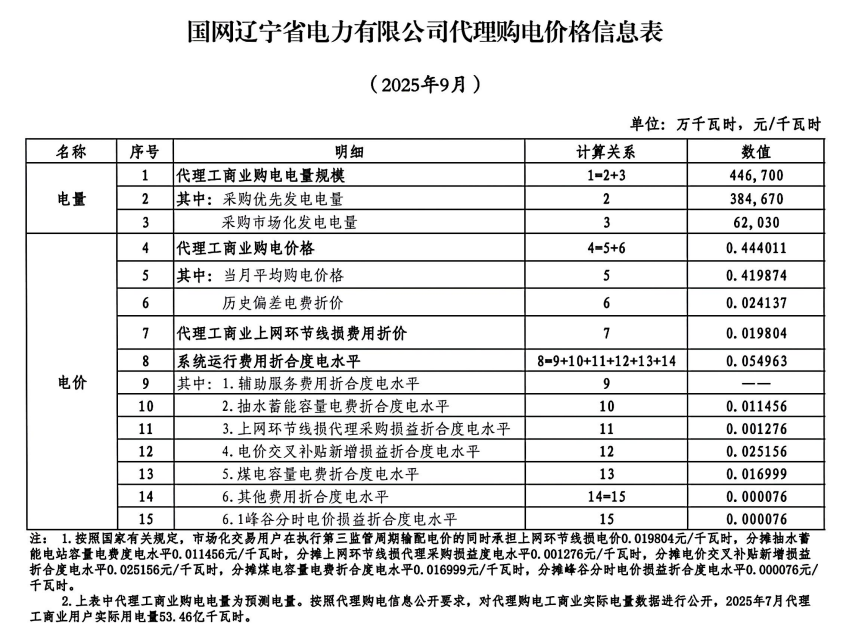 國(guó)網(wǎng)遼寧省電力有限公司代理購(gòu)電工商業(yè)用戶電價(jià)表(2025年9月)