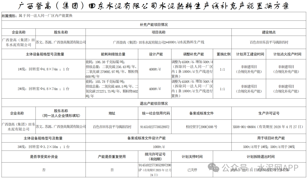 廣西登高(集團)田東水泥1#、2#4000t/d生產(chǎn)線各補充產(chǎn)能500t/d,退出產(chǎn)能來自同公司3#1000生產(chǎn)線,置換比例1:1。