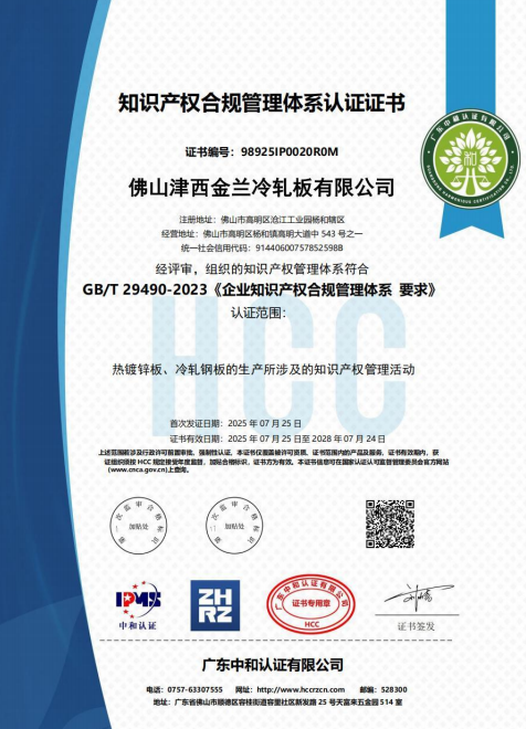 近日,津西金蘭成功通過《企業(yè)知識產(chǎn)權(quán)合規(guī)管理體系要求》(GB/T 29490-2023)認(rèn)證并獲得認(rèn)證證書。這標(biāo)志著津西金蘭在知識產(chǎn)權(quán)創(chuàng)造、運(yùn)用、保護(hù)及管理領(lǐng)域邁上了規(guī)范化、標(biāo)準(zhǔn)化、系統(tǒng)化的新階段,為公司持續(xù)提升創(chuàng)新能力和核心競爭力奠定堅實基礎(chǔ)。