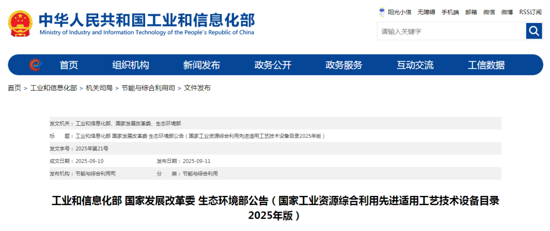 9月11日,為加快推動(dòng)工業(yè)固廢源頭減量和規(guī)?;?,提升再生資源綜合利用水平,發(fā)展高端智能再制造,工業(yè)和信息化部、國家發(fā)展改革委、生態(tài)環(huán)境部編制了《國家工業(yè)資源綜合利用先進(jìn)適用工藝技術(shù)設(shè)備目錄(2025年版)》,于工信部官網(wǎng)進(jìn)行了公示。