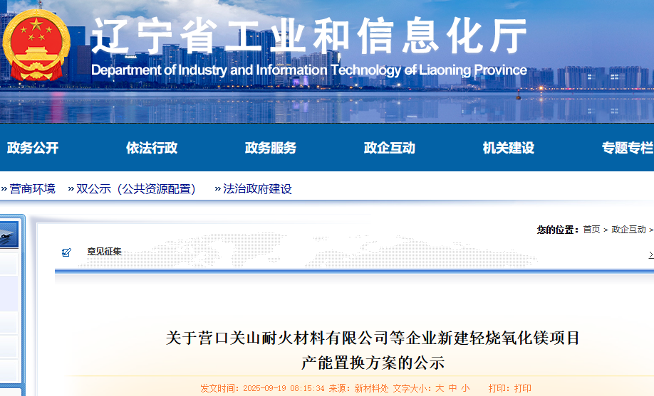 按照《遼寧省人民政府辦公廳關(guān)于推進菱鎂行業(yè)高質(zhì)量發(fā)展的實施意見》(遼政辦發(fā)〔2023〕15號)、《遼寧省菱鎂礦浮選及鎂砂行業(yè)產(chǎn)能置換辦法》(遼工信建材〔2024〕18號)要求,根據(jù)菱鎂行業(yè)專項整治工作進展,經(jīng)企業(yè)申請、市工信部門初審、我廳審核,現(xiàn)將營口關(guān)山耐火材料有限公司等企業(yè)新建輕燒氧化鎂項目產(chǎn)能置換方案予以公示,公示期10個工作日。