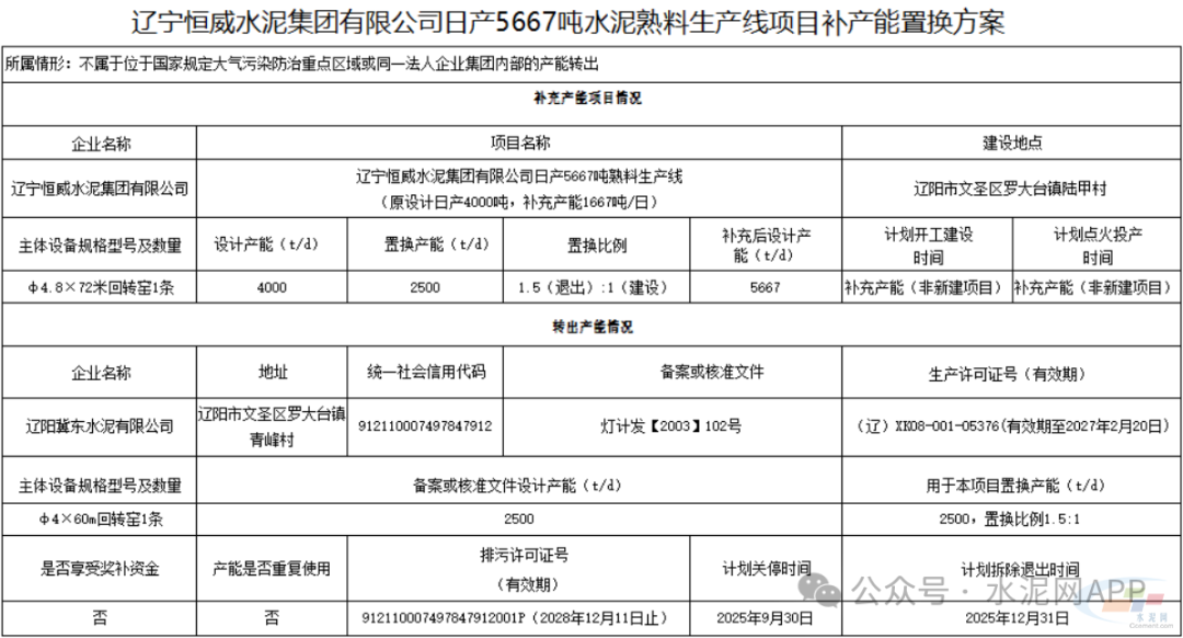 置換方案顯示,遼寧恒威水泥4000t/d熟料生產(chǎn)線補充產(chǎn)能1667t/d,補充后產(chǎn)能為5667t/d,退出產(chǎn)能來自遼陽冀東水泥一條2500t/d熟料生產(chǎn)線。