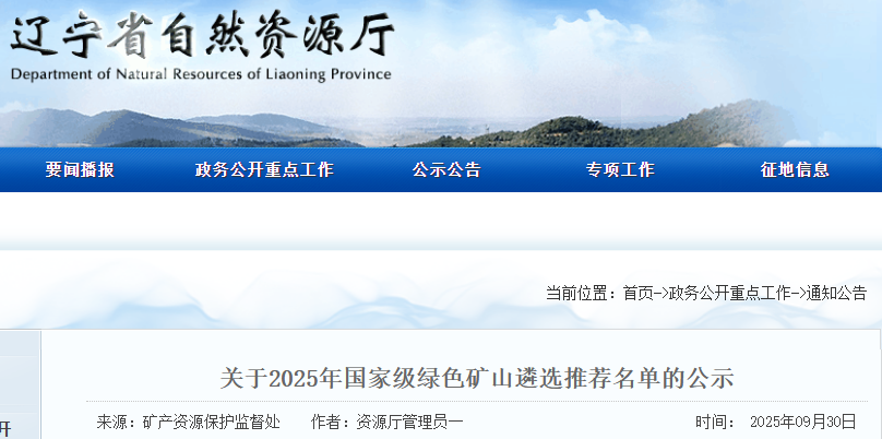 按照《關于進一步加強綠色礦山建設的通知》(自然資規(guī)〔2024〕1號)和《自然資源部辦公廳關于開展新一批國家級綠色礦山遴選工作的通知》(自然資辦發(fā)〔2025〕8號)相關要求,遼寧省自然資源廳嚴格組織開展國家級綠色礦山遴選推薦工作。經企業(yè)自主申報、省廳綜合評審,現擇優(yōu)確定5家企業(yè)作為2025年國家級綠色礦山遴選推薦對象,具體名單詳見附件。