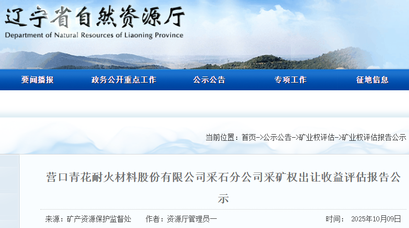 營口青花耐火材料股份有限公司采石分公司采礦權(quán)出讓收益評估報(bào)告通過遼寧省自然資源廳門戶網(wǎng)站向社會(huì)公示,公示10個(gè)工作日。如有異議,請于公示之日起10個(gè)工作日內(nèi)以電話方式先向省自然資源廳礦產(chǎn)資源保護(hù)監(jiān)督處提出簡要意見,隨后及時(shí)將書面意見反饋到省自然資源廳礦產(chǎn)資源保護(hù)監(jiān)督處。