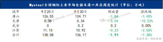 通過對全國六城20家主流倉庫及港口進行調查統(tǒng)計,當前9月30日鋼坯倉儲庫存136.17萬噸,周環(huán)比減少1.91萬噸。從重點區(qū)域來看,唐山鋼坯庫存124.71萬噸,周環(huán)比下降1.84萬噸。其中三大主流倉儲庫存周環(huán)比增加0.86萬噸,下游調坯廠需求減少,鋼坯倉儲庫存由降轉增。而港口庫存因為出口資源疏港下降2.7萬噸,港口庫存的下降導致唐山整體庫存的下降。