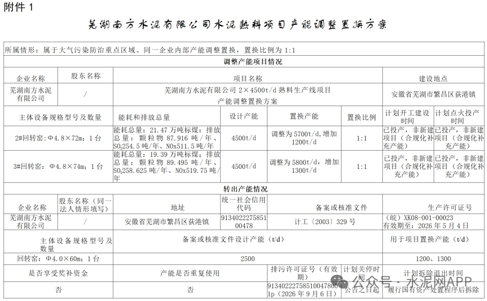 根據(jù)《水泥玻璃行業(yè)產(chǎn)能置換實施辦法(2024年本)》等文件要求,蕪湖南方水泥有限公司將2#、3#水泥熟料生產(chǎn)線(產(chǎn)能均為4500t/d)通過補產(chǎn)能方式分別增加到5700t/d、5800t/d,置換產(chǎn)能來自本企業(yè)1#水泥熟料生產(chǎn)線(產(chǎn)能為2500t/d),產(chǎn)能調(diào)整置換比例為1:1。安徽海螺水泥股份有限公司白馬山水泥廠擬將1條4000t/d水泥熟料生產(chǎn)線通過補產(chǎn)能方式增加到5250t/d,置換產(chǎn)能來自蕪湖市華楊水泥有限責任公司(產(chǎn)能1250t/d)、蕪湖瑞信水泥有限公司(產(chǎn)能1250t/d),置換比例為2:1。