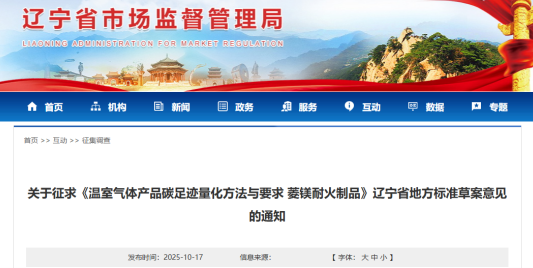 《溫室氣體產品碳足跡量化方法與要求 菱鎂耐火制品》遼寧省地方標準草案已完成,現公開征求意見。請于2025年11月17日前,將意見反饋至遼寧省市場監(jiān)督管理局標準處。