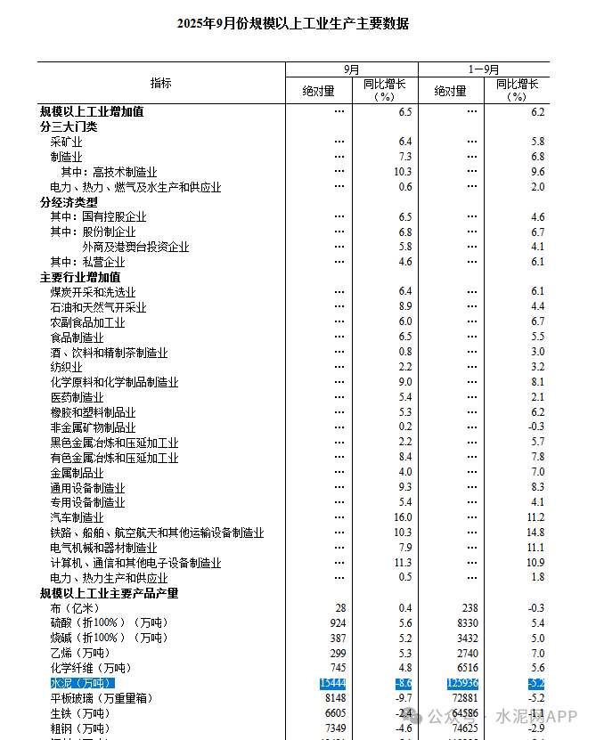據(jù)國(guó)家統(tǒng)計(jì)局?jǐn)?shù)據(jù),9月份,規(guī)模以上工業(yè)增加值同比實(shí)際增長(zhǎng)6.5%(增加值增速均為扣除價(jià)格因素的實(shí)際增長(zhǎng)率)。從環(huán)比看,9月份,規(guī)模以上工業(yè)增加值比上月增長(zhǎng)0.64%。1—9月份,規(guī)模以上工業(yè)增加值同比增長(zhǎng)6.2%。其中水泥行業(yè)9月份產(chǎn)量15444萬(wàn)噸,同比下降8.6%,1-9月全國(guó)水泥產(chǎn)量125936萬(wàn)噸,同比下降5.2%。此外,數(shù)據(jù)顯示,2024年1-9月全國(guó)水泥產(chǎn)量為132670萬(wàn)噸,由此計(jì)算,今年1-9月水泥全口徑產(chǎn)量比去年同期減少6734萬(wàn)噸,降幅5.08%。