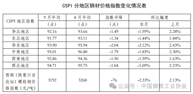 分地區(qū)來看,2025年9月份,CSPI全國六大地區(qū)鋼材價格指數(shù)平均值環(huán)比均下降。其中,降幅較大的為華東地區(qū),為2.12%,降幅較小的為西北地區(qū),為1.09%。
