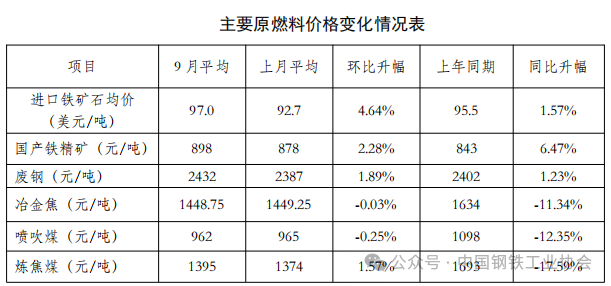 從原燃料來看,與8月相比,主要原燃料各品種平均價格以上升為主。其中,進(jìn)口鐵礦石漲幅較大,為4.64%,煉焦煤漲幅較小,為1.57%,冶金焦、噴吹煤均價較為平穩(wěn)。(見下表)