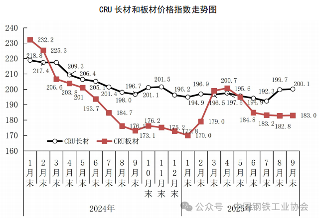 2025年1—9月,CRU國際鋼材價格指數(shù)平均值為189.7 點(diǎn),同比下降12.6點(diǎn),降幅為6.2 %。其中,CRU長材指數(shù)平均值為196.4點(diǎn),同比下降11.4點(diǎn),降幅為5.5 %;CRU板材指數(shù)平均值為186.4點(diǎn),同比下降13.2點(diǎn),降幅為6.6 %。