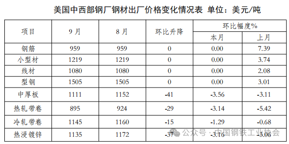 2025年9月份,CRU北美鋼材價格指數(shù)為232.7點(diǎn),環(huán)比下降4.4點(diǎn),降幅為1.9%;美國制造業(yè)PMI為49.1%,環(huán)比上升0.4個百分點(diǎn)。本月美國中西部鋼廠鋼材品種走勢分化,鋼筋、小型材、線材、型鋼價格較上月持平,其余品種價格有所下降,中厚板降幅較大,為3.56%,冷軋帶卷降幅較小,為1.29%。(見下表)