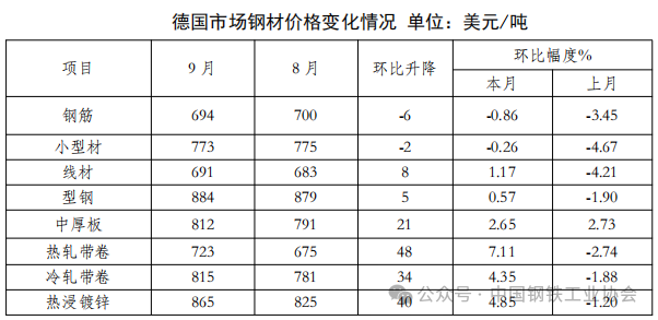 9月份,CRU歐洲鋼材價格指數(shù)為207.6點(diǎn),環(huán)比上升5.8點(diǎn),升幅為2.9 %;2025年9月,歐元區(qū)制造業(yè)PMI終值為49.8,較上月小幅下滑,歐元區(qū)制造業(yè)在8月份短暫擴(kuò)張后,于9月份再度陷入了收縮區(qū)間,主要成員國制造業(yè)PMI均有所下降:德國、法國、意大利、西班牙制造業(yè)PMI指數(shù)分別為49.5%、48.2%、49%、51.5%,分別降0.3、2.2、1.4和2.8個百分點(diǎn)。本月德國市場主要鋼材品種價格走勢分化,鋼筋穩(wěn)中有降,小型材平穩(wěn)運(yùn)行,線材、型鋼穩(wěn)中有升,其余品種價格均明顯上升,熱軋帶卷升幅較大,為7.11%,中厚板升幅較小,為2.65%。(見下表)