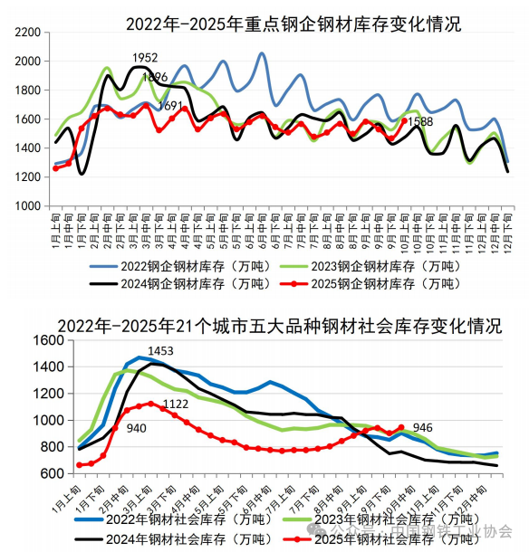 企業(yè)庫存來看,10月上旬重點(diǎn)鋼企鋼材庫存環(huán)比同比明顯增加。2025年10月上旬,重點(diǎn)統(tǒng)計(jì)鋼鐵企業(yè)鋼材庫存量1588萬噸,環(huán)比上一旬增加121萬噸,增長8.2%;比年初增加351萬噸,增長28.4%;比上月同旬增加6萬噸,增長0.6%;比去年同旬增加115萬噸,增長7.8%。