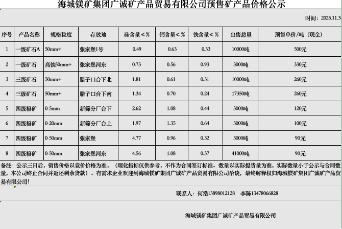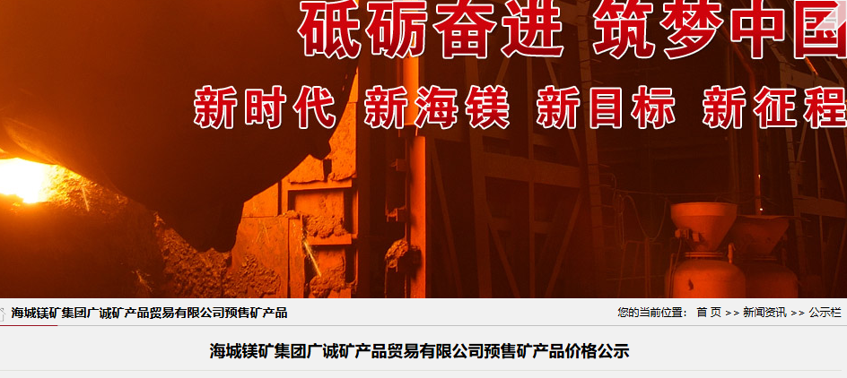 海城鎂礦集團(tuán)廣誠(chéng)礦產(chǎn)品貿(mào)易有限公司預(yù)售礦產(chǎn)品價(jià)格公示