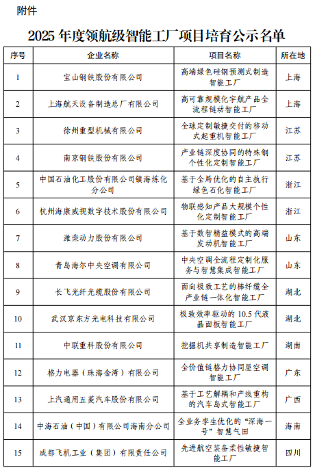 附件:2025年度領(lǐng)航級智能工廠項目培育公示名單