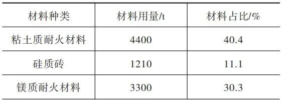 耐火材料是玻璃熔爐的主要構(gòu)筑材料,對玻璃的質(zhì)量、能耗和成本起著決定性的作用,直接影響著玻璃熔爐的壽命。在行業(yè)標準JC/T60004—2019《玻璃窯用耐火材料使用規(guī)程》的編制說明中,玻璃熔窯主要分為與玻璃液直接接觸的熔池部位、熔池上部火焰空間結(jié)構(gòu)、蓄熱室及煙道系統(tǒng)等三大部分。各部位工作溫度、對耐材侵蝕情況不同,選用耐火材料時需考慮各部位的使用特點和要求,并結(jié)合玻璃品種、產(chǎn)品質(zhì)量定位、燃料種類、窯爐規(guī)模、設計窯齡等因素,使各部位材料使用壽命更加均衡,達到經(jīng)濟、合理的目的。表4為700t/d浮法玻璃熔窯約需各類耐火材料情況,其中使用最多的是粘土質(zhì)耐火材料、鎂質(zhì)耐火材料和硅質(zhì)磚,分別占熔窯耐火材料所需求量的40.4%、30.3%和11.1%。
