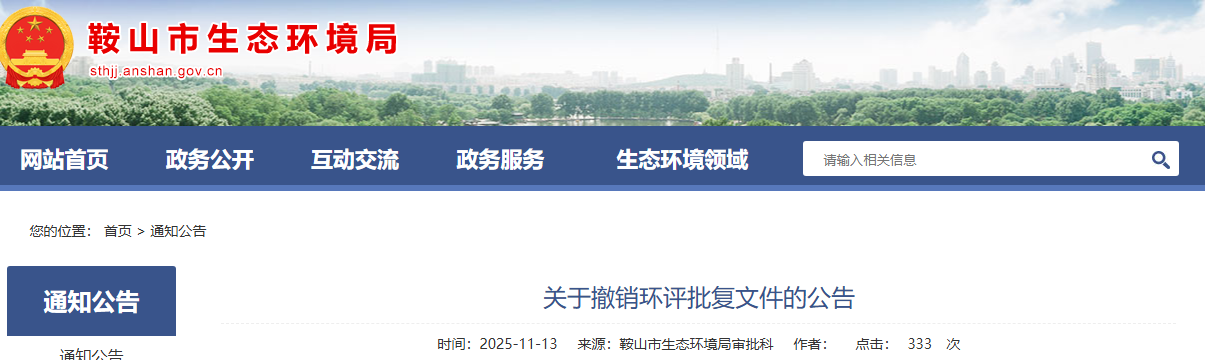 現(xiàn)建設單位申請撤銷該環(huán)評批復,依據(jù)《中華人民共和國行政許可法》第六十九條規(guī)定,經(jīng)研究,我局依法決定撤銷《海城市軒鎂耐火材料有限公司改擴建項目環(huán)境影響報告表的批復》(鞍行審批復環(huán)〔2023〕14號),現(xiàn)予以公告。