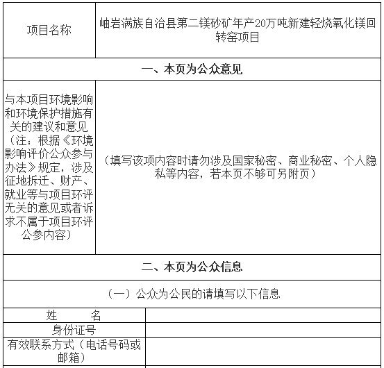 公共參與意見表可通過發(fā)送電子郵箱到651043036@qq.com或岫巖滿族自治縣第二鎂砂礦。
