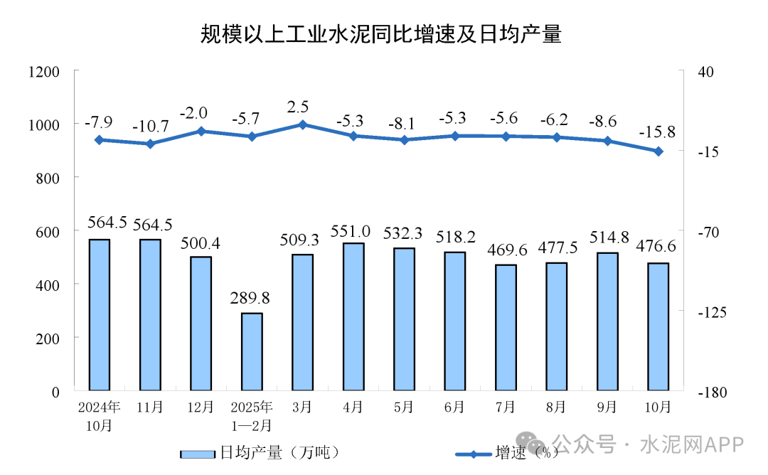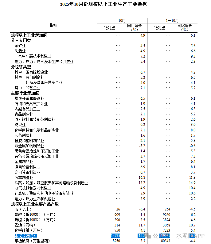 其中水泥行業(yè)10月份全國水泥產(chǎn)量14775萬噸,下降15.8%;1-10月全國水泥產(chǎn)量139985萬噸,同比下降6.7%。