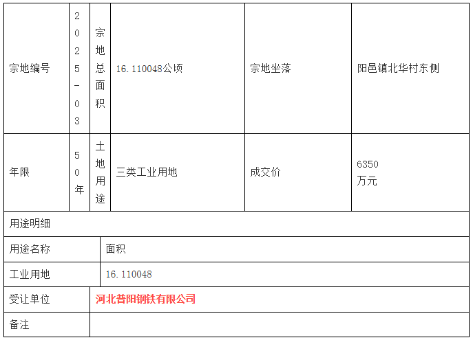 近日,河北普陽鋼鐵有限公司以6350萬元成功競得武安市陽邑鎮(zhèn)北華村東側一宗工業(yè)用地,總面積達16.110048公頃,使用年限50年。該地塊通過公開掛牌方式出讓,符合《中華人民共和國土地管理法》等相關法規(guī)要求。