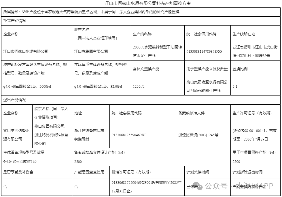 置換方案顯示,江山市何家山水泥有限公司2000t/d熟料生產(chǎn)線補(bǔ)充產(chǎn)能1250t/d,補(bǔ)充后產(chǎn)能為3250t/d,退出產(chǎn)能來(lái)自兆山集團(tuán)諸暨水泥有限公司一條2500t/d熟料生產(chǎn)線,置換比例2:1。