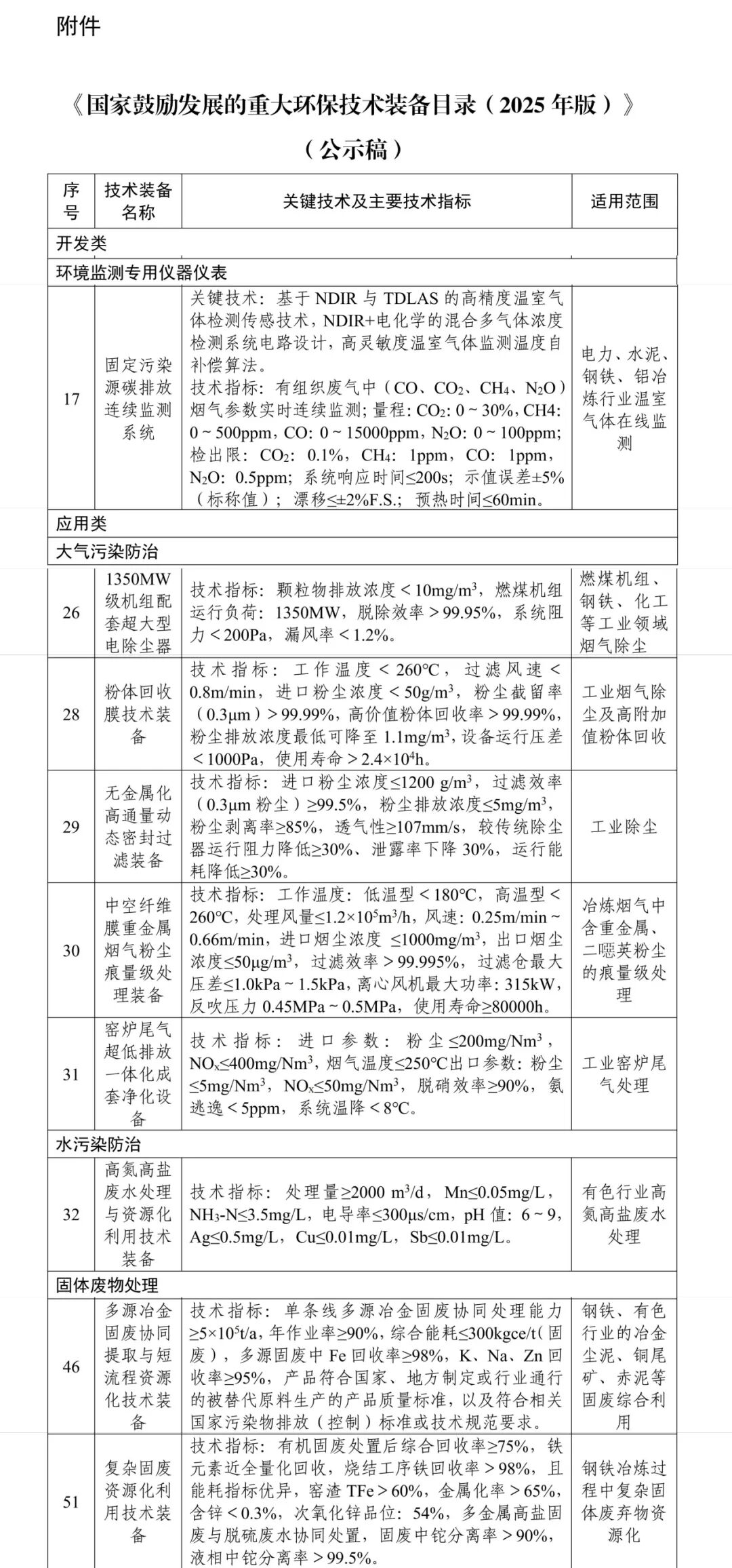 根據(jù)《關(guān)于開展2025年國家鼓勵(lì)發(fā)展的重大環(huán)保技術(shù)裝備推薦工作的通知》(工信廳聯(lián)節(jié)函〔2025〕127號)要求,經(jīng)企業(yè)申報(bào)、省級有關(guān)主管部門及有關(guān)行業(yè)協(xié)會和中央企業(yè)推薦、專家評審等,工業(yè)和信息化部、生態(tài)環(huán)境部共同組織編制了《國家鼓勵(lì)發(fā)展的重大環(huán)保技術(shù)裝備目錄(2025年版)》,現(xiàn)予公示。如有異議,請?jiān)诠酒趦?nèi)將書面意見反饋至工業(yè)和信息化部節(jié)能與綜合利用司。
