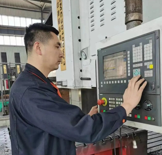 11月14日上午9時許,營口鍛壓機(jī)床有限責(zé)任公司機(jī)加車間內(nèi)工人忙碌,機(jī)器轟鳴。一臺10米數(shù)控龍門銑床旁,工藝室主任殷曉鵬正在為出口印度的4000噸級數(shù)控電動螺旋壓力機(jī)加工零件。