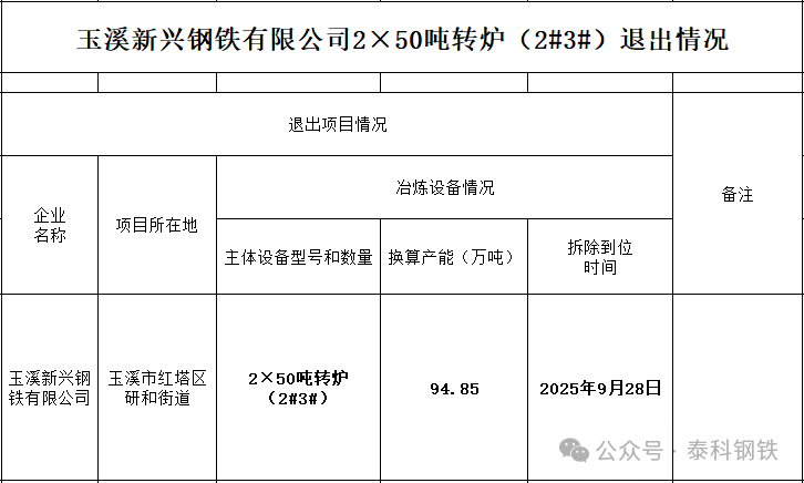 2025年10月23日,玉溪市工業(yè)和信息化局發(fā)布關(guān)于玉溪新興鋼鐵有限公司2×50噸轉(zhuǎn)爐(2#3#)退出情況的公示,玉溪新興鋼鐵有限公司2×50噸轉(zhuǎn)爐(2#3#)已于2025年9月28日拆除到位,退出。