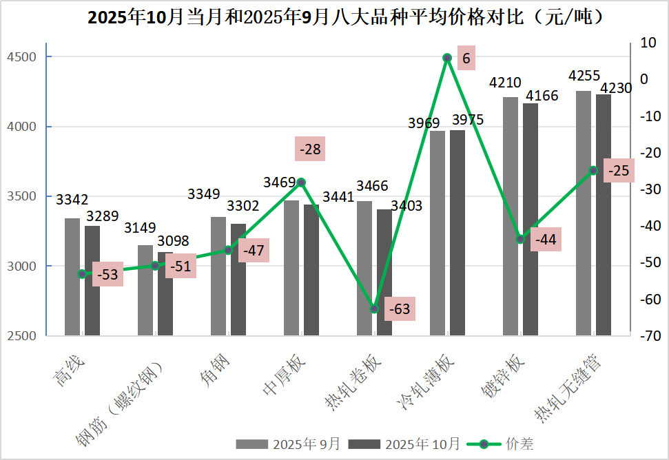 據(jù)鋼鐵協(xié)會(huì)監(jiān)測(cè),2025年10月份,CSPI平均值為91.92 點(diǎn),環(huán)比下降1.26點(diǎn),降幅為1.35%;同比下降9.10點(diǎn),降幅為9.01%。其中,CSPI長(zhǎng)材指數(shù)平均值為92.23點(diǎn),環(huán)比下降1.49點(diǎn),降幅為1.58%;同比下降13.04點(diǎn),降幅為12.39%。板材指數(shù)平均值為91.17點(diǎn),環(huán)比下降1.15點(diǎn),降幅為1.25%;同比下降6.80點(diǎn),降幅為6.94%。