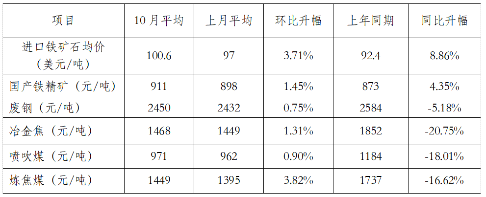 從原燃料來(lái)看,與9月相比,主要原燃料各品種平均價(jià)格均上升。其中,煉焦煤漲幅較大,為3.82%,廢鋼漲幅較小,為0.75%,原燃料對(duì)鋼價(jià)的支撐作用有所增強(qiáng)。(見(jiàn)下表)