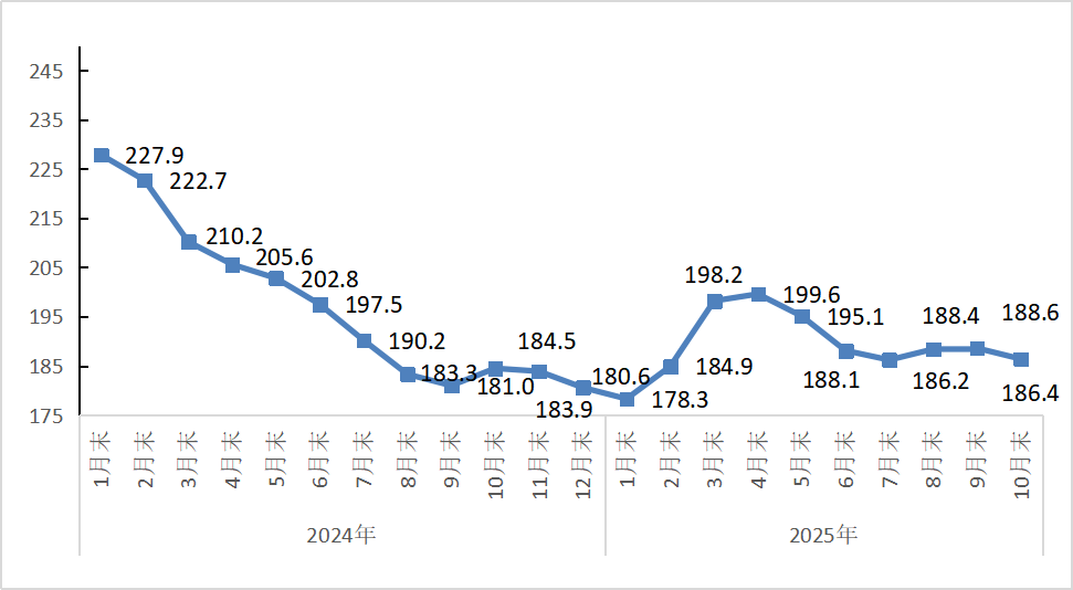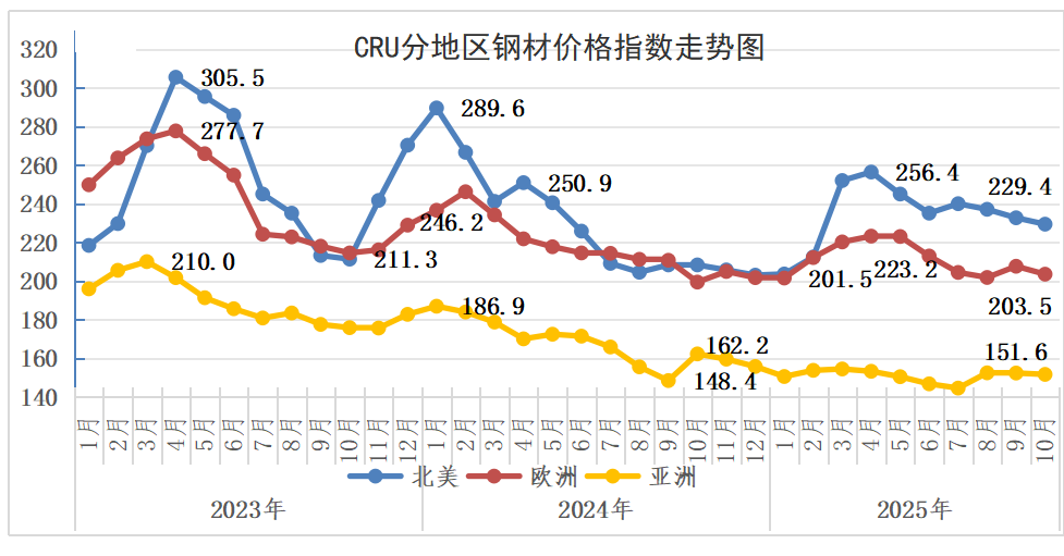 2025年10月份,CRU國(guó)際鋼材價(jià)格指數(shù)為186.4點(diǎn),環(huán)比下降2.2點(diǎn),降幅為1.2%;同比上升1.9點(diǎn),同比升幅為1.0 %。(見(jiàn)下圖)