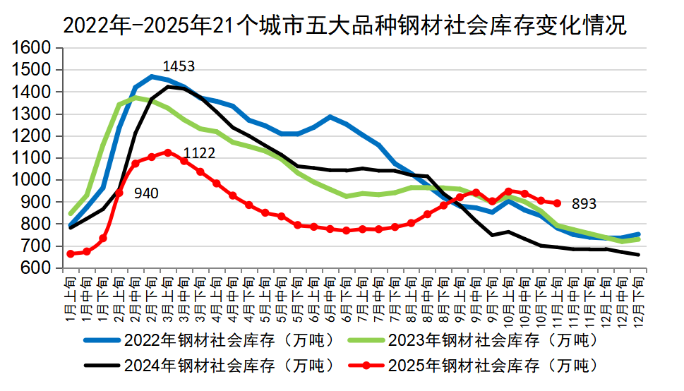 從社會(huì)庫(kù)存來(lái)看,近期,鋼材社會(huì)庫(kù)存持續(xù)位于近四年歷史同期高位。進(jìn)入10月,社會(huì)庫(kù)存雖有所下滑,但去庫(kù)速度較為緩慢,持續(xù)處于近四年歷史同期高位,表明鋼鐵行業(yè)需求旺季不旺特征明顯,至11月上旬,21個(gè)城市5大品種鋼材社會(huì)庫(kù)存893萬(wàn)噸,環(huán)比減少12萬(wàn)噸,下降1.3%,庫(kù)存繼續(xù)下降,降幅收窄;比年初增加234萬(wàn)噸,上升35.5%;比上年同期增加200萬(wàn)噸,上升28.9%。當(dāng)前高社會(huì)庫(kù)存和偏弱的需求是行業(yè)面臨的核心矛盾,對(duì)鋼材價(jià)格形成一定的下行壓力。