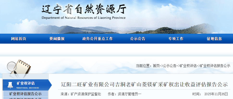 遼陽(yáng)二旺礦業(yè)有限公司吉洞老礦山菱鎂礦采礦權(quán)出讓收益評(píng)估報(bào)告通過(guò)遼寧省自然資源廳門戶網(wǎng)站向社會(huì)公示,公示10個(gè)工作日。如有異議,請(qǐng)于公示之日起10個(gè)工作日內(nèi)以電話方式先向省自然資源廳礦產(chǎn)資源保護(hù)監(jiān)督處提出簡(jiǎn)要意見(jiàn),隨后及時(shí)將書面意見(jiàn)反饋到省自然資源廳礦產(chǎn)資源保護(hù)監(jiān)督處。