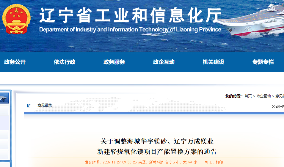 按照《遼寧省人民政府辦公廳關(guān)于推進(jìn)菱鎂行業(yè)高質(zhì)量發(fā)展的實(shí)施意見(jiàn)》(遼政辦發(fā)〔2023〕15號(hào))、《遼寧省菱鎂礦浮選及鎂砂行業(yè)產(chǎn)能置換辦法》(遼工信建材〔2024〕18號(hào))要求,根據(jù)菱鎂行業(yè)專項(xiàng)整治工作進(jìn)展,經(jīng)企業(yè)申請(qǐng)、市級(jí)審核、省級(jí)復(fù)核,我廳于2025年11月13日至11月26日,對(duì)海城華宇鎂砂、遼寧萬(wàn)成鎂業(yè)新建輕燒氧化鎂項(xiàng)目產(chǎn)能置換方案進(jìn)行了公示,公示期間無(wú)異議,現(xiàn)予通告。