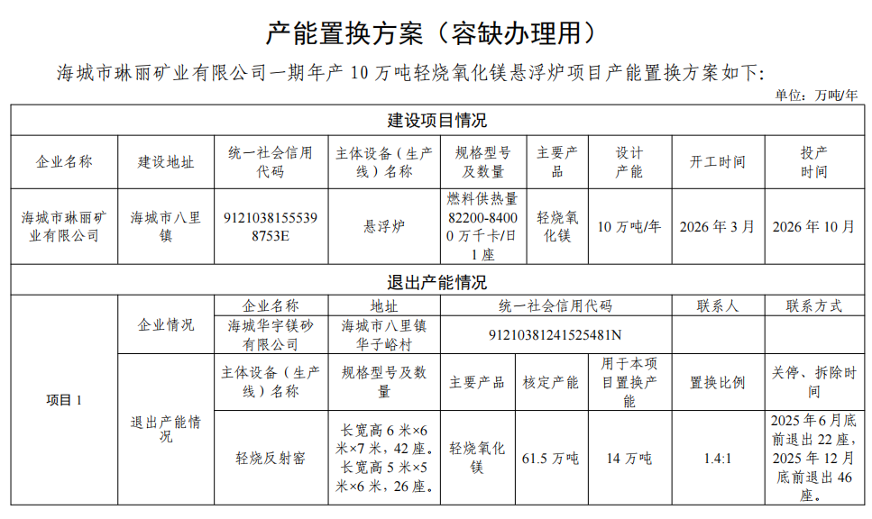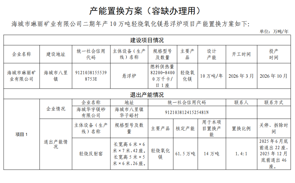 1.海城市琳麗礦業(yè)有限公司一期年產(chǎn)10萬(wàn)噸輕燒氧化鎂懸浮爐項(xiàng)目產(chǎn)能置換方案
