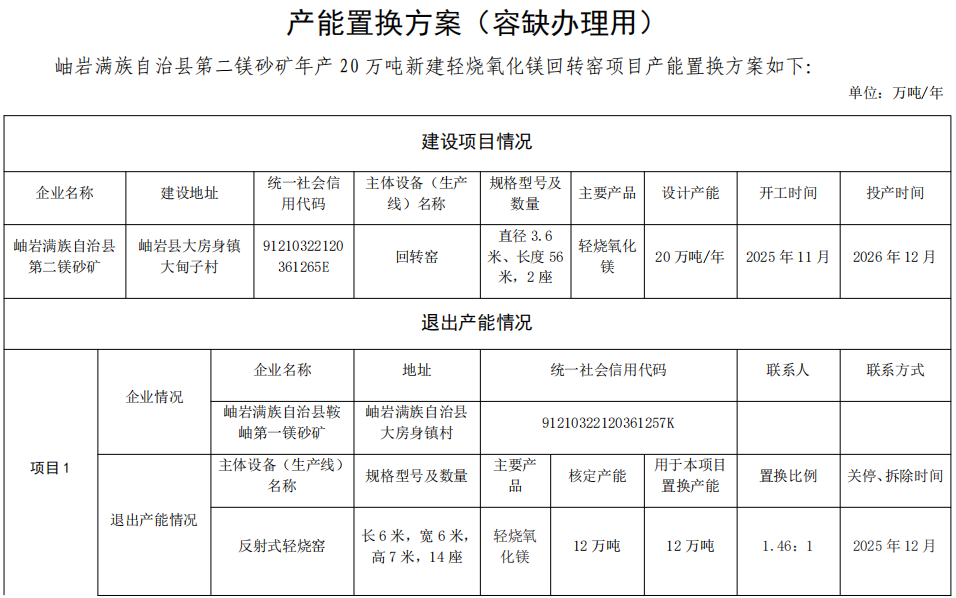3.岫巖滿族自治縣第二鎂砂礦年產(chǎn)20萬(wàn)噸新建輕燒氧化鎂回轉(zhuǎn)窯項(xiàng)目產(chǎn)能置換方案