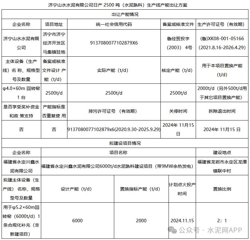 根據(jù)公示,福建省永定興鑫水泥有限公司擬在福建省龍巖市永定區(qū)龍?zhí)舵?zhèn)聯(lián)中村建設(shè)一條6000t/d水泥熟料建設(shè)項(xiàng)目(帶9MW余熱發(fā)電),置換比例2:1,計(jì)劃2024年11月15日點(diǎn)火投產(chǎn)。用于本項(xiàng)目置換產(chǎn)能為濟(jì)寧山水水泥有限公司2000t/d(另外500t/d用于其它項(xiàng)目置換產(chǎn)能)φ4.0×60m 回轉(zhuǎn)窯1臺,計(jì)劃2024年11月15日拆除退出。