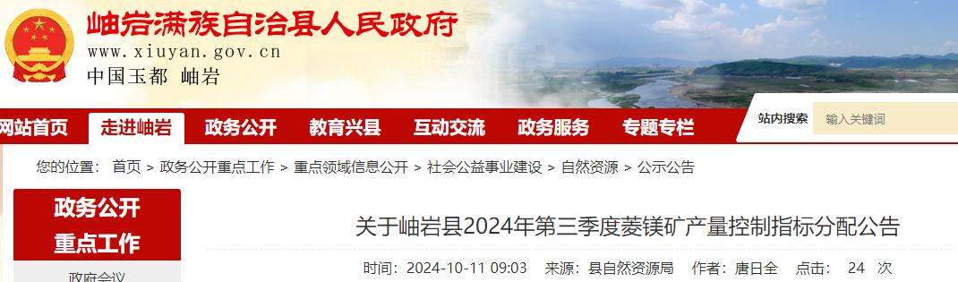 根據(jù)鞍山市菱鎂行業(yè)專(zhuān)項(xiàng)整治工作推進(jìn)組辦公室《關(guān)于鞍山市2024年第三季度菱鎂礦產(chǎn)量控制指標(biāo)預(yù)分配的通知》(鞍鎂辦〔2024〕1號(hào)),現(xiàn)對(duì)岫巖縣2024年第三季度菱鎂礦產(chǎn)量控制指標(biāo)分配情況予以公告。