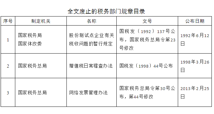 近日,國家稅務(wù)總局發(fā)布《關(guān)于公布廢止和修改的部分稅務(wù)部門規(guī)章及規(guī)范性文件目錄的決定》。根據(jù)《規(guī)章制定程序條例》《稅務(wù)規(guī)范性文件制定管理辦法》有關(guān)規(guī)定,對(duì)稅務(wù)部門規(guī)章及稅務(wù)規(guī)范性文件進(jìn)行了清理。其中,對(duì)以下3件稅務(wù)部門規(guī)章予以廢止。